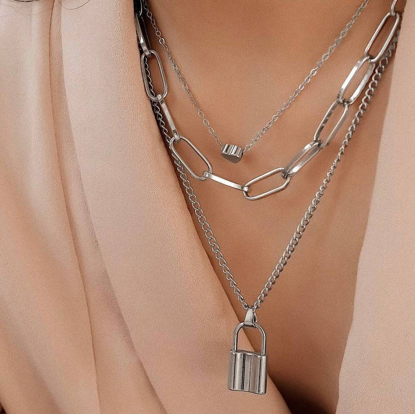 Многослойная цепь на шею разного плетения с подвесками замок и сердце колье и ожерелье серебро - бижутерия