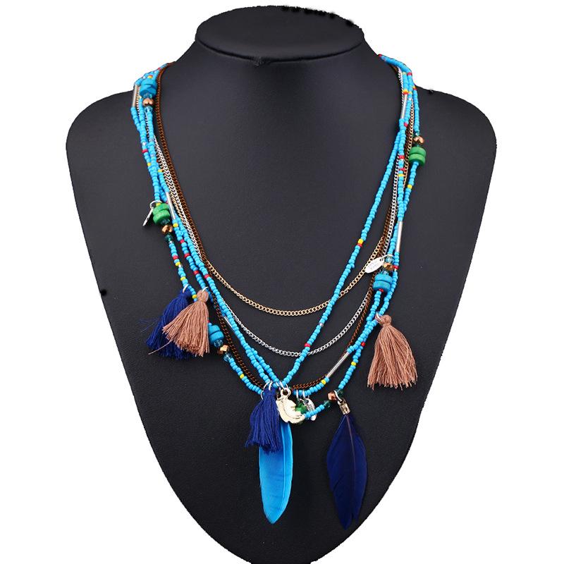 Многослойное ожерелье ручной работы из бисера в стиле бохо с перьями, кисточками и бусинами из смоляного риса синий