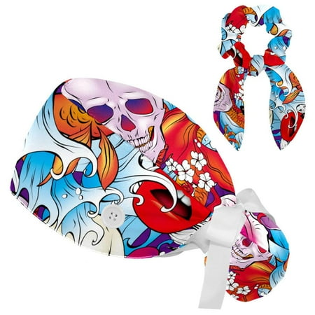 Working Cap with Buttons and Sweatband Scrub Hat Bouffant Caps with Scrunchie Skull Tie Back Hats
