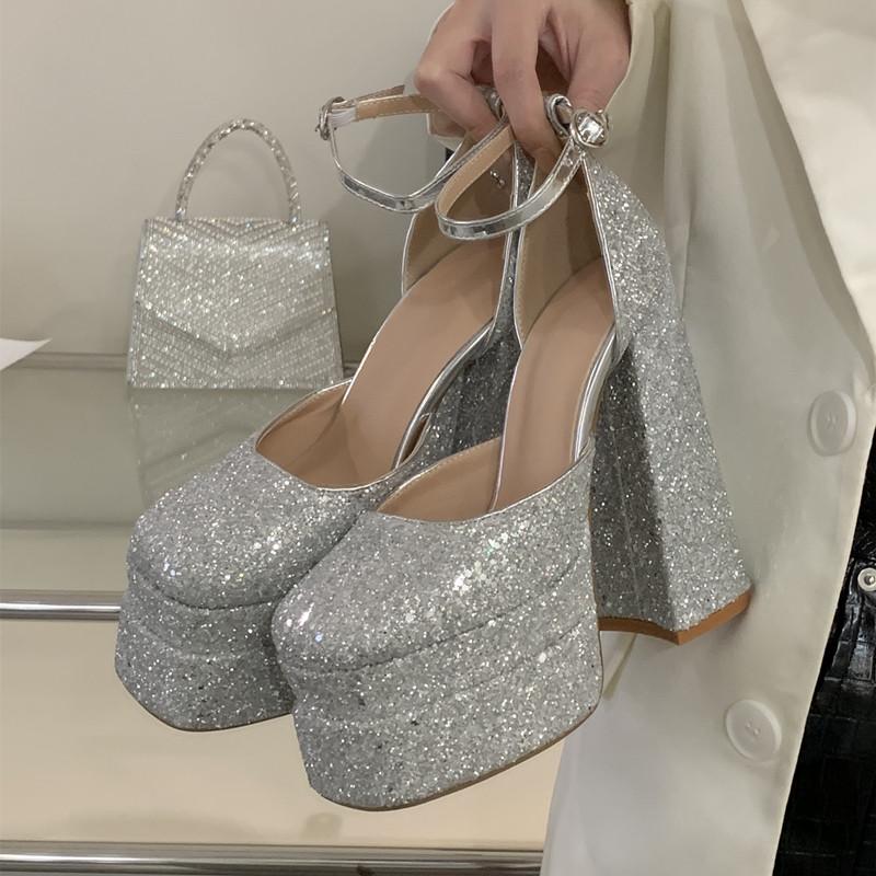 Мода Блеск Блеск Мода Расшитые Пайетками Клинья на Двойной Платформе Женские Гладиаторские Сандалии Летние Сексуальные 15см Ультра Высокие Каблуки Вечерние Туфли для Выпускного 42