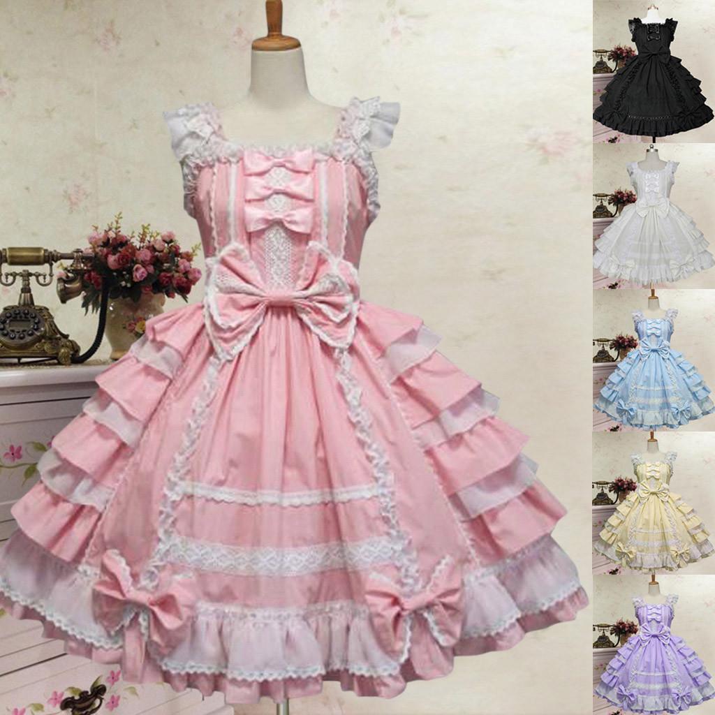 Мода Женщины Винтаж Готический Лук Кружева Flounce Длинный рукав Лоскутное платье