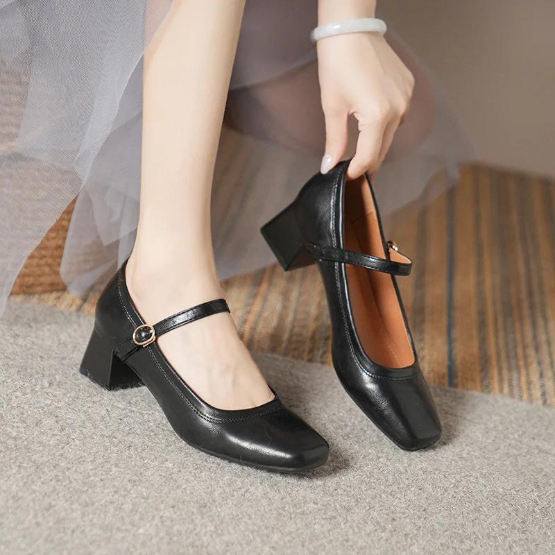 Мода Женщины Новая Квадратная Голова Однотонный Большой Мелкий Вырез Плоская Пуговица Ремешок Яркая Кожа Лицо Женские Туфли на Высоком Каблуке Одинарные 4 41 чёрный