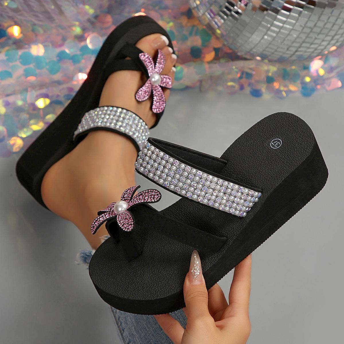 Мода Роскошные Сандалии с Кристаллами в Виде Цветка на Клипсе для Пальца Женские Легкие Кристальные Сандалии на Танкетке Женские Большого Размера 36-42 Платформенные Шлепанцы Mujer 36 розовый