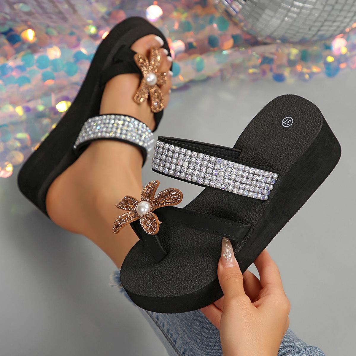 Мода Роскошные Сандалии с Кристаллами в Виде Цветка на Клипсе для Пальца Женские Легкие Кристальные Сандалии на Танкетке Женские Большого Размера 36-42 Платформенные Шлепанцы Mujer 42 хаки