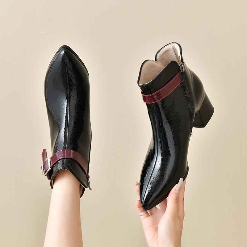 Мода 2024 Весна и Осень Новые Модные Заостренные Цветные Кожаные Лицевые Пряжки Боковая Молния Удобные Ботильоны Одиночные Ботинки 40 чёрный