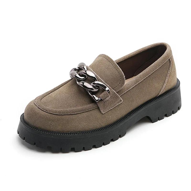 Мода 2024 Женские мокасины Модные цепочные замшевые туфли из натуральной кожи в британском стиле Женская весенняя обувь Большие размеры Студенческая обувь для женщин 39 серый