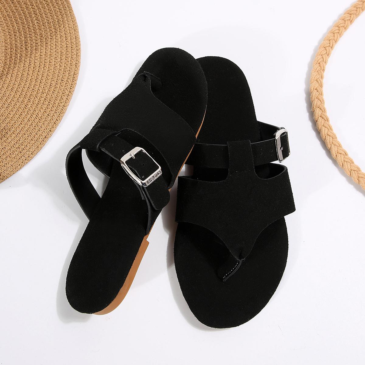 Мода 2024 Лето Женские шлепанцы с перемычкой для пальца, Римская пряжка, Однотонные, На плоской подошве, Повседневные, Пляжные, Удобные шлепанцы 35 чёрный