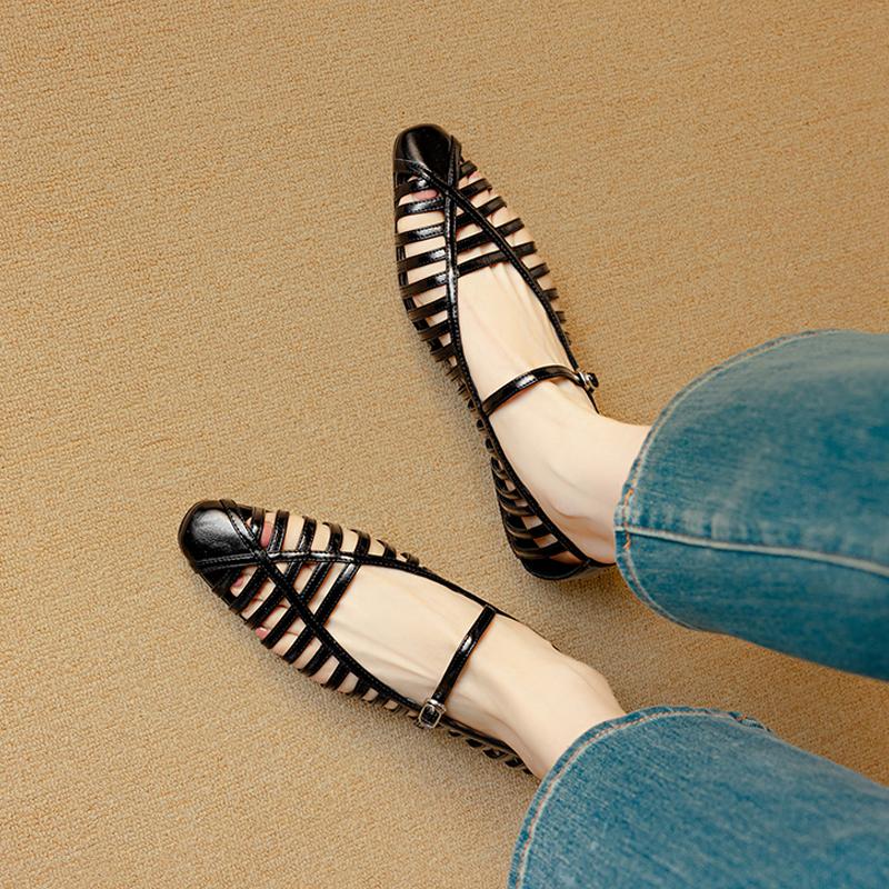 Мода 2025 НОВЫЕ Летние Женские Сандалии Натуральная Кожа Женская Обувь Острый Носок Средний Каблук Узкий Ремешок Закрытый Носок Каблук Современные Сандалии 34 чёрный