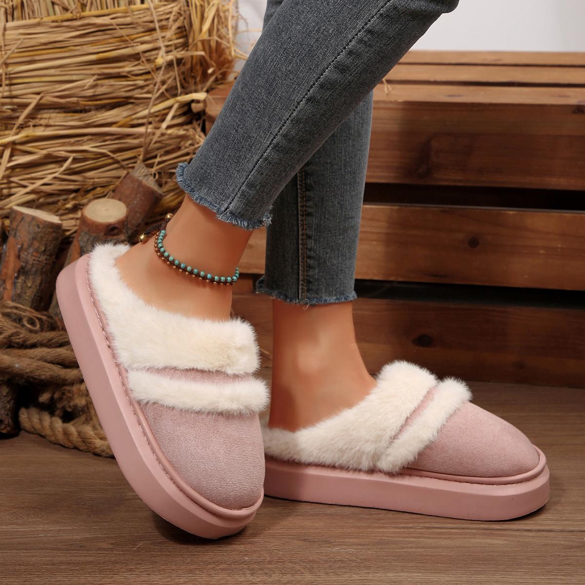 Мода 2025 Новые меховые тапочки для женщин Зимние пушистые модные теплые на толстой подошве плюшевые уютные шлепанцы Зимняя домашняя хлопковая платформа 40-41 розовый