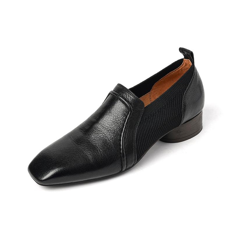 Мода 2025 Осень Новые Натуральная Кожа Мягкие Рабочие Туфли Женские Высокий Каблук Эластичные Квадратный Носок Слипоны Коричневый Хаки Британский Стиль Каблуки Женские 34 чёрный