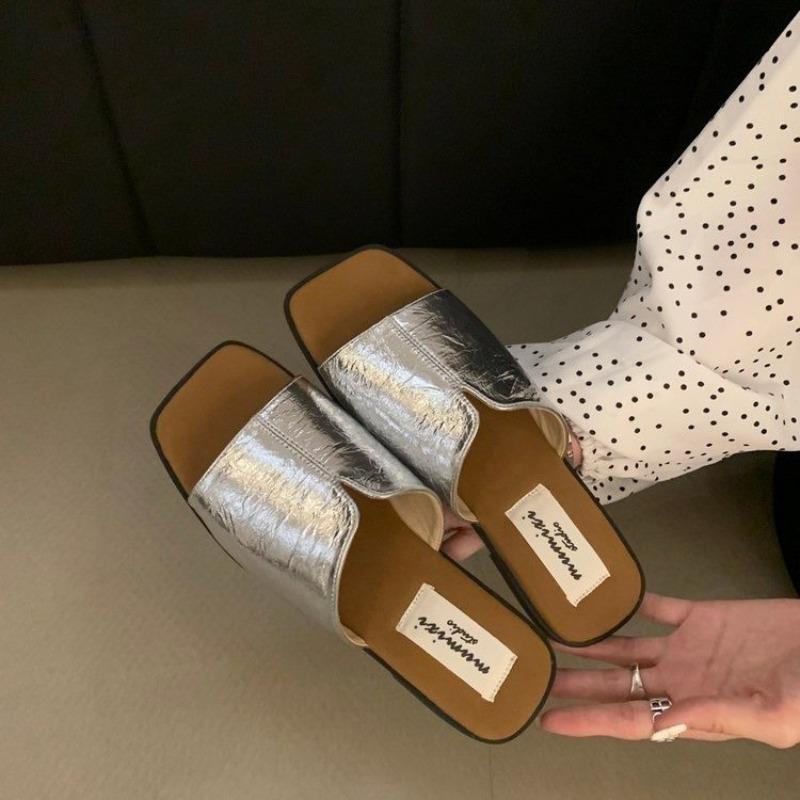Мода 2025 Стильные минималистичные сандалии-слайдеры на одной лямке Однотонные женские тапочки Летняя уличная повседневная обувь с открытым носком на плоской подошве Осень 40 серебряный