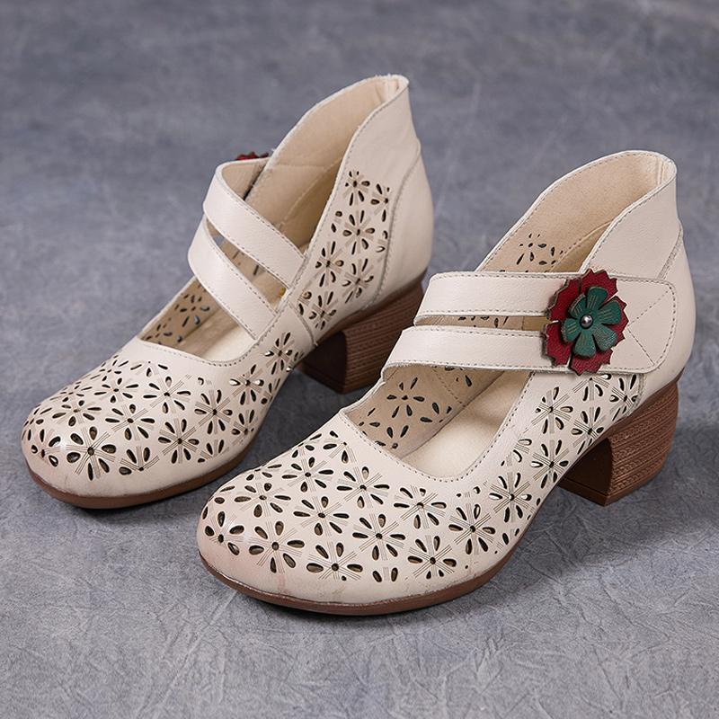 Мода GKTINOO 2025 Весна Модные Цветы Натуральная Кожа Туфли-лодочки Перфорация Толстый Каблук Ремешок Средний Каблук Мягкая Подошва Обувь для Мамы Сандалии 40