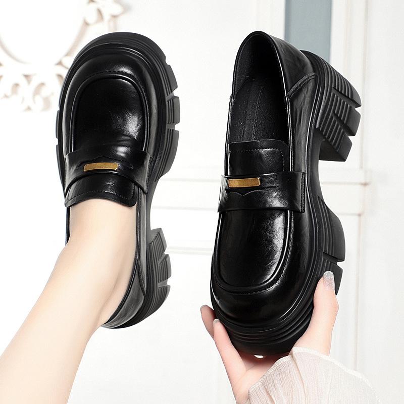 Модная Удобная Кожаная Обувь на Толстой Подошве Весна Осень Новая Обувь Женская с Круглым Носком Универсальная В Британском Стиле Лоферы на Толстом Каблуке 36