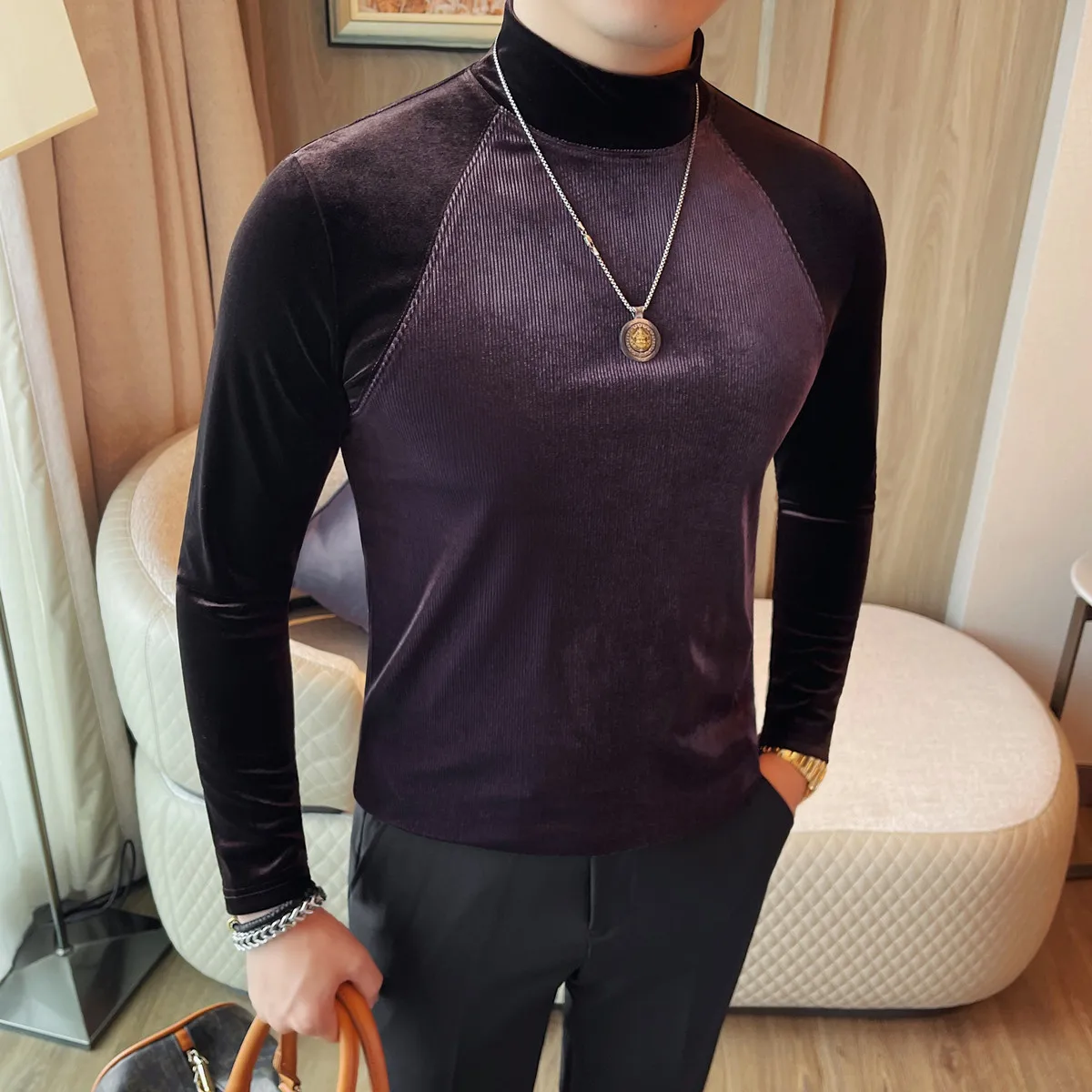 Модная бархатная футболка в стиле пэчворк, мужская осенне-зимняя новая мужская футболка с длинным рукавом, облегающие повседневные эластичные топы, футболки Homme