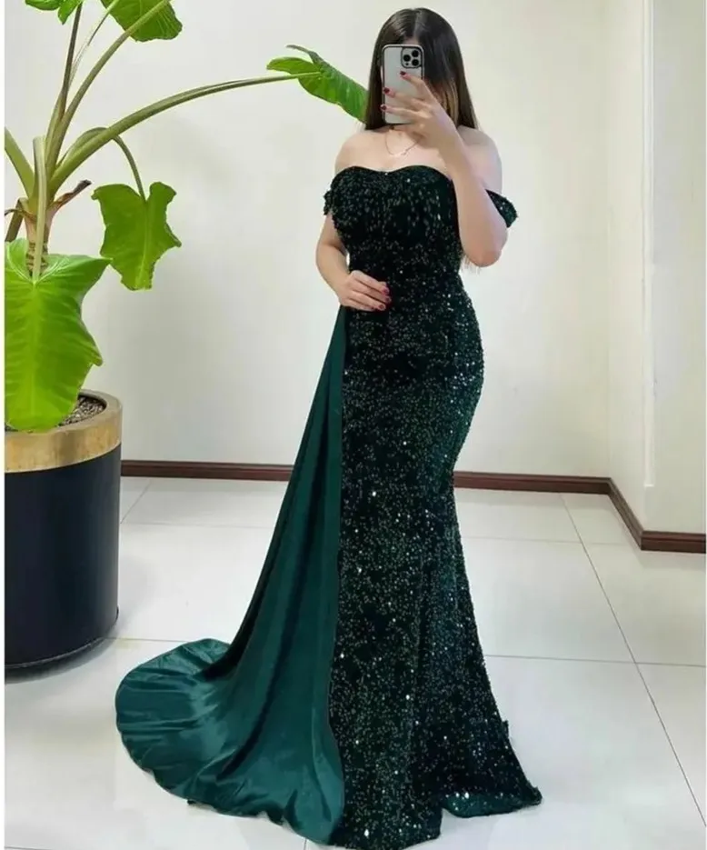 Long Off Shoulder Sequined Evening Dresses Mermaid Satin Sweep Train Prom Gowns Robes de soirée Party Dress Вечерние платья