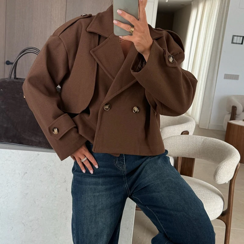 Модная двубортная теплая верхняя одежда, женская повседневная уличная одежда, однотонное пальто, элегантная офисная осенняя куртка с лацканами и длинными рукавами