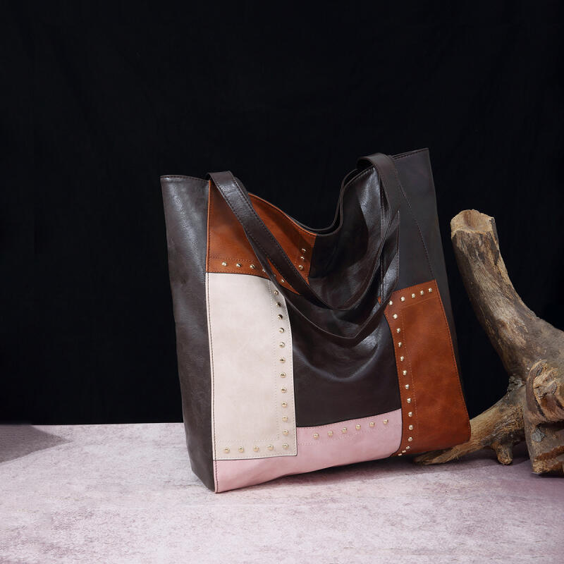 Модная женская мягкая сумка-тоут из искусственной кожи с заклепками, винтажная женская сумка через плечо большой емкости, повседневная контрастная цветная сумка в стиле пэчворк