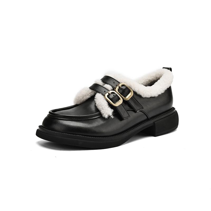 Модная женская новая зимняя обувь с круглым носком, толстой подошвой и большой металлической пряжкой ремня, повседневная обувь Оксфорд в стиле ретро, теплая меховая одинарная обувь 245 чёрный
