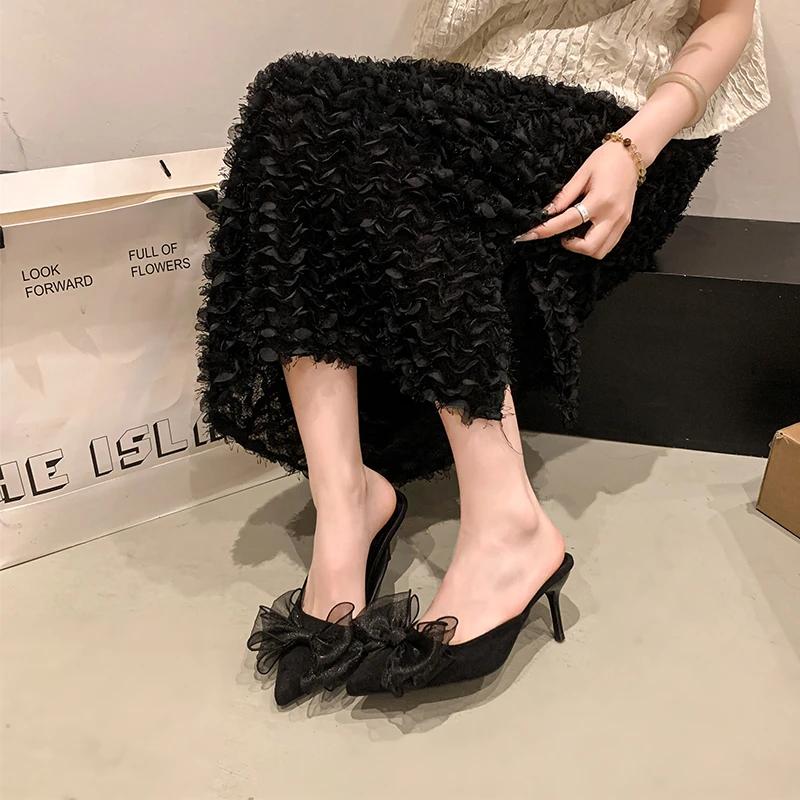 Модная женская обувь Летняя мода Неглубокие Элегантные женские шлепанцы Новые Уличные Нарядные Туфли Бант Большой Размер Леопардовый принт Высокий каблук 42 чёрный