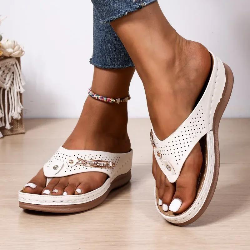 Модная женская обувь Новые летние шлепанцы с открытым носком Женские тапочки для улицы Металлическая отделка Платформа Клиновидные сандалии Большой размер Повседневные тапочки 43