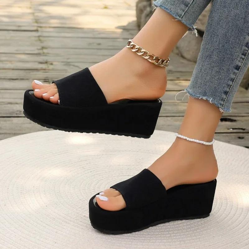 Модная женская обувь в продаже 2025 Горячая распродажа Базовые повседневные шлепанцы Женская мода Большой размер Летние женские босоножки на платформе с танкеткой и открытым носком 43 чёрный