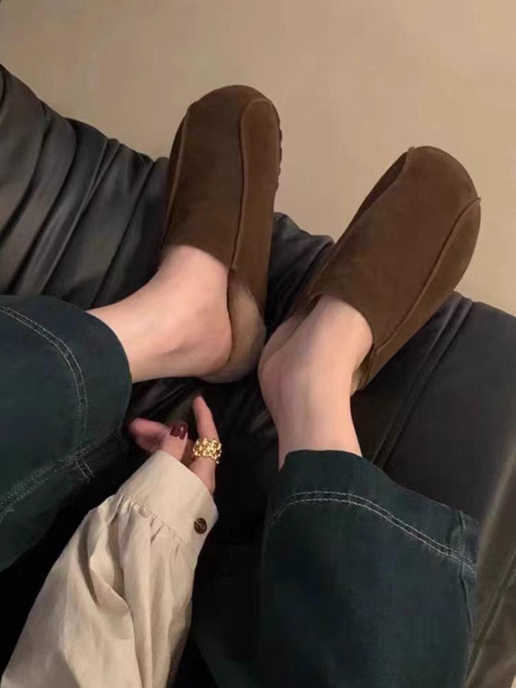 Модная женская обувь на толстой подошве, с закрытым носком, круглым носком, замшевые полушлепанцы, женские осенне-зимние новые балетки на ремешке, слипоны, хлопковые тапочки 35 кофейный