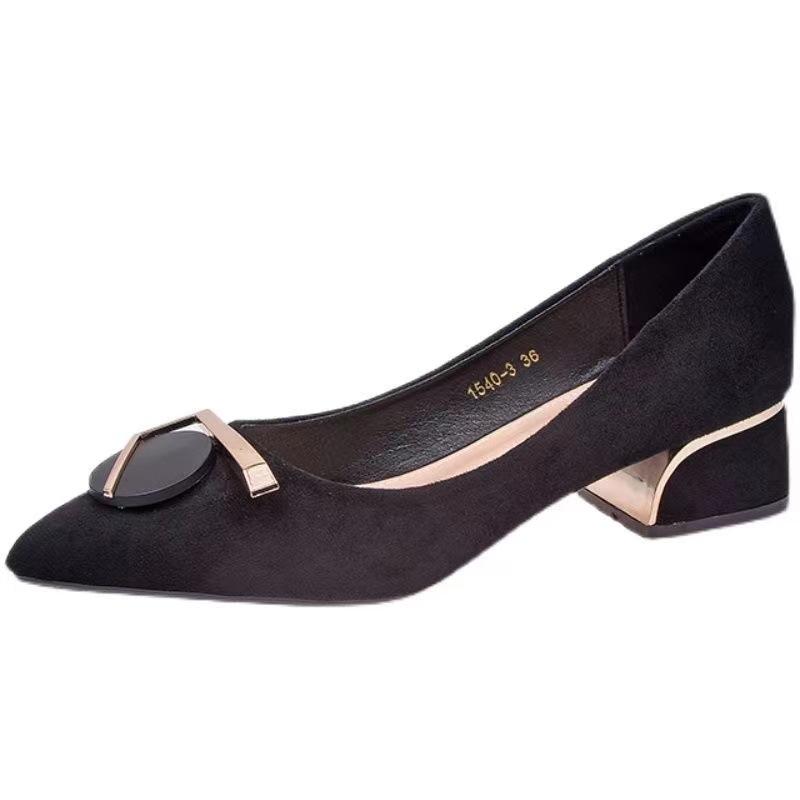 Модная женская обувь одинарная с острым носком замшевая на среднем каблуке на толстом каблуке женская обувь сказочная нежная мягкая подошва 34 чёрный