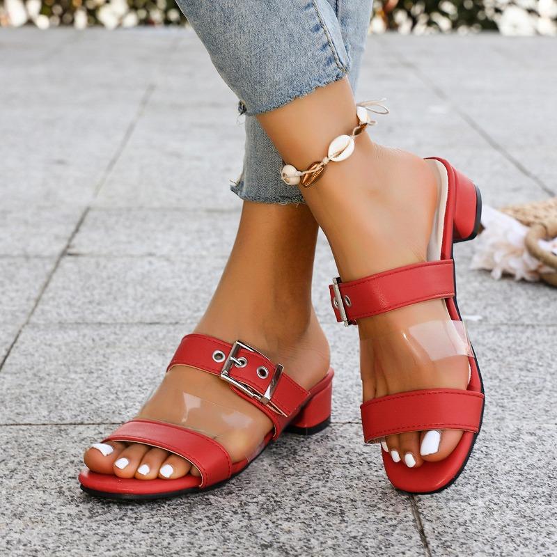 Модная женская обувь 2025 Модные женские шлепанцы с открытым носком Летние Новые Уличные С Пряжкой на Ремне Большого Размера Платье Бестселлер Однотонные Каблуки Женщины 43 красный