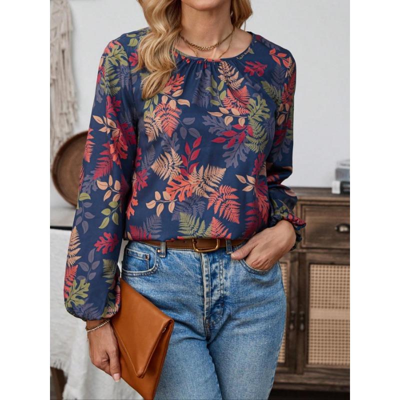 Модная женская рубашка с длинным рукавом и принтом, новая, с круглым вырезом, свободная, простая, офисная блузка, винтажная, с цветочным принтом, весенняя, плиссированная, элегантные женские топы, одежда 3569 2XL