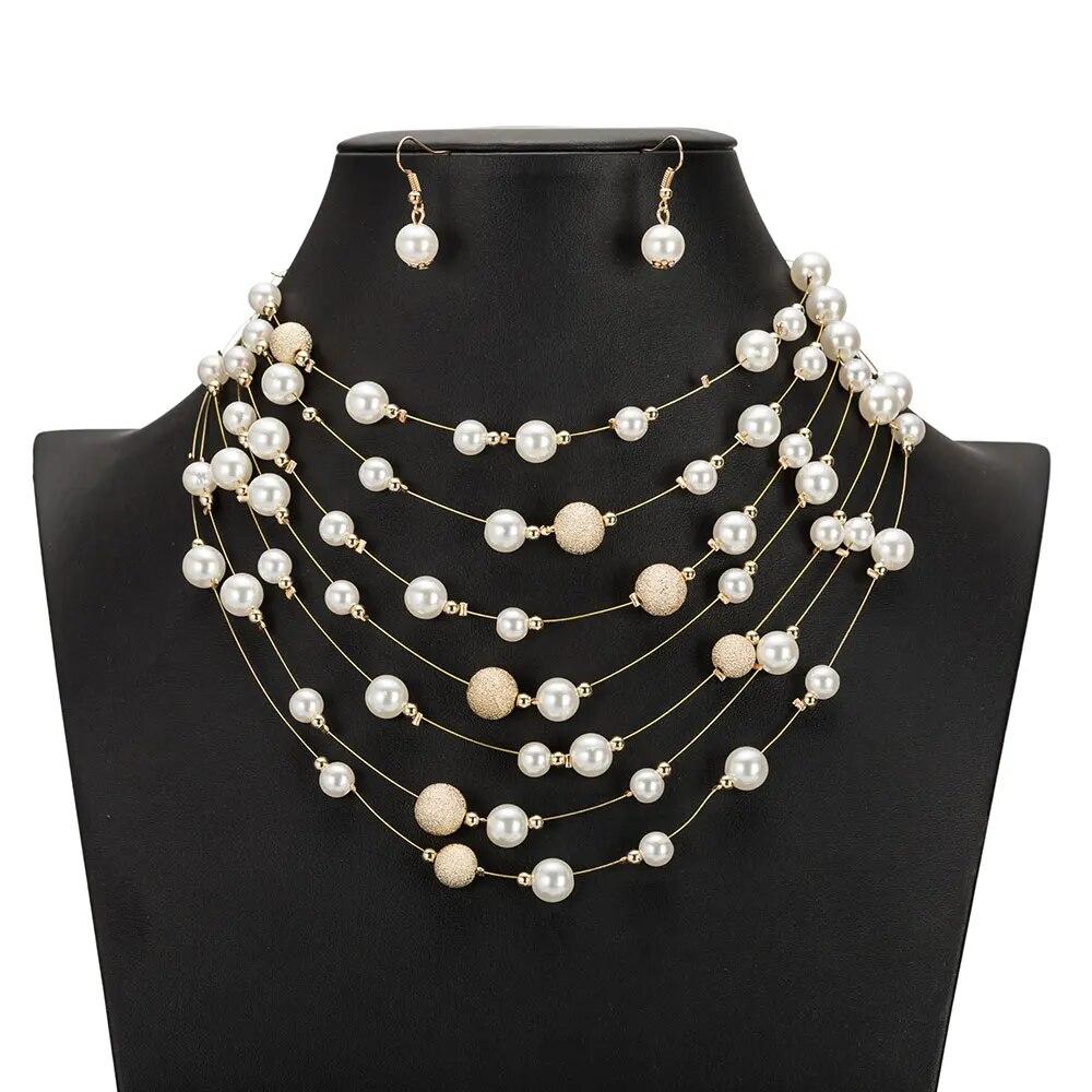 Модная золотая многослойная цепочка с искусственным жемчугом, женское вечернее ожерелье и серьги для невесты