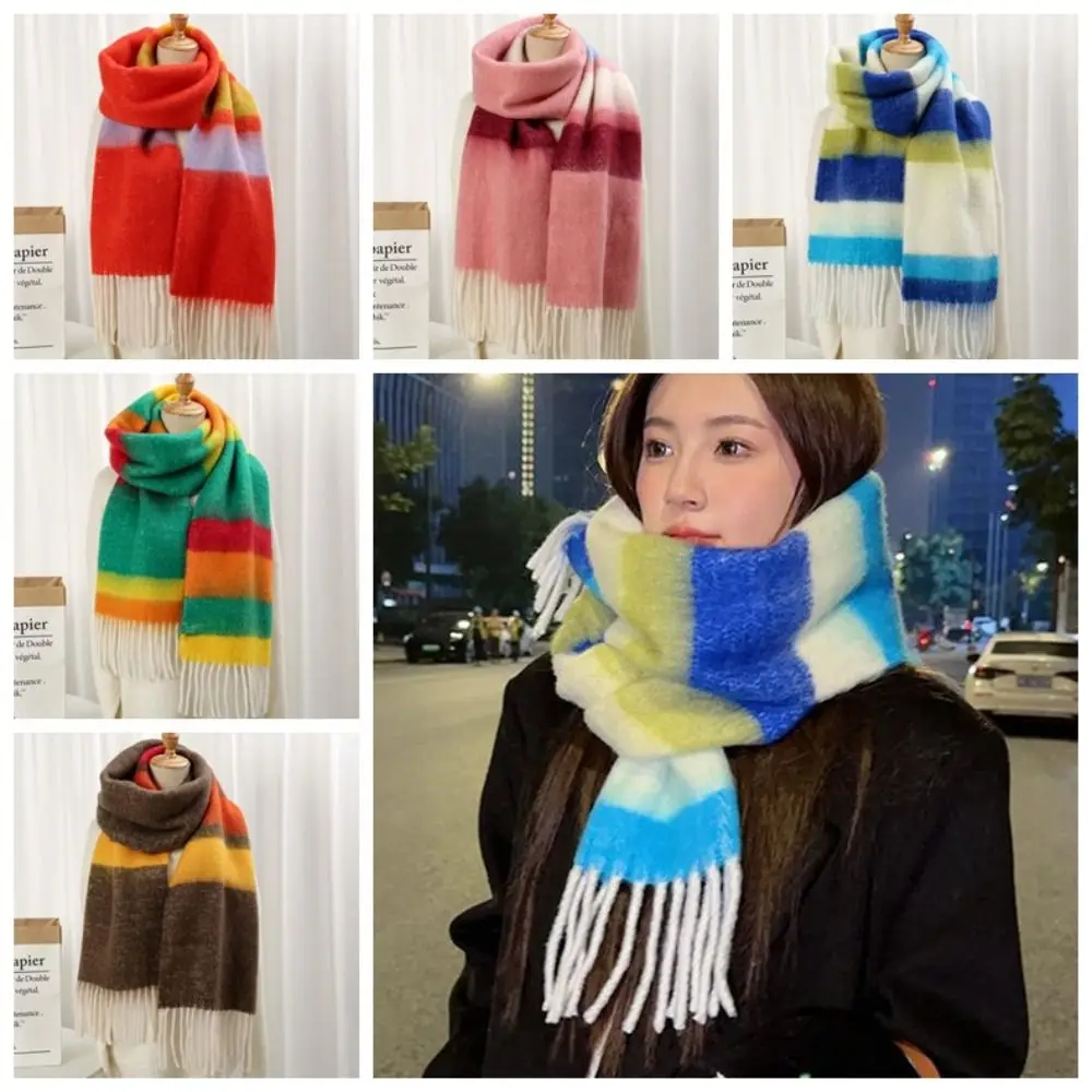 Модная красочная полосатая шаль из мохера в корейском стиле, холодостойкий длинный шарф с кисточками, шейный платок, утепленные зимние шерстяные шарфы, уличные