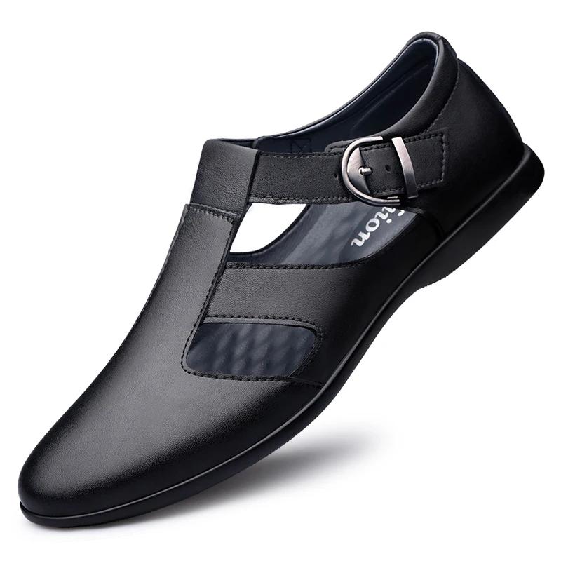 Модная летняя новая полая дышащая кожаная обувь мужская деловая сандалии высококачественная кожа повседневная мягкая обувь удобные пляжные сандалии 45 чёрный