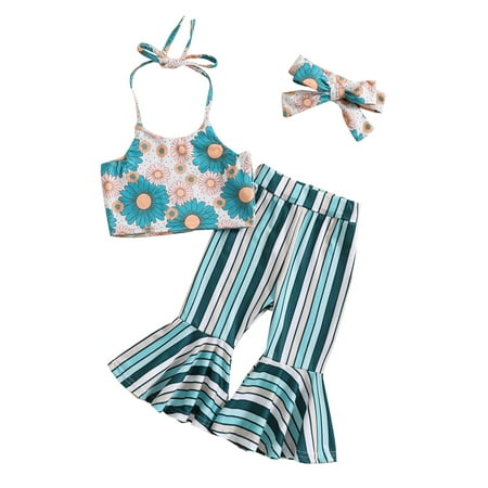 Arvbitana Toddler Baby Girl Summer Clothes Sleeveless Flower Print Crop Tank Top Rainbow Bell Bottoms and Headband 3Pcs 6 Months-5 Years
