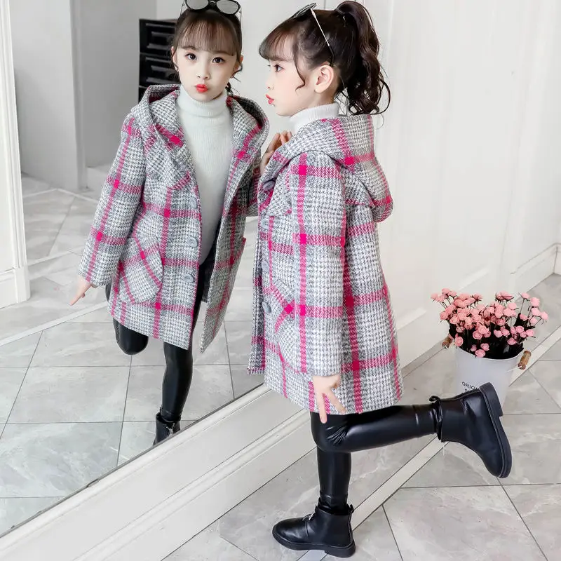 Модная осенне-зимняя куртка для девочек, шерстяное детское длинное пальто с капюшоном, детская одежда, клетчатая верхняя одежда для маленьк...