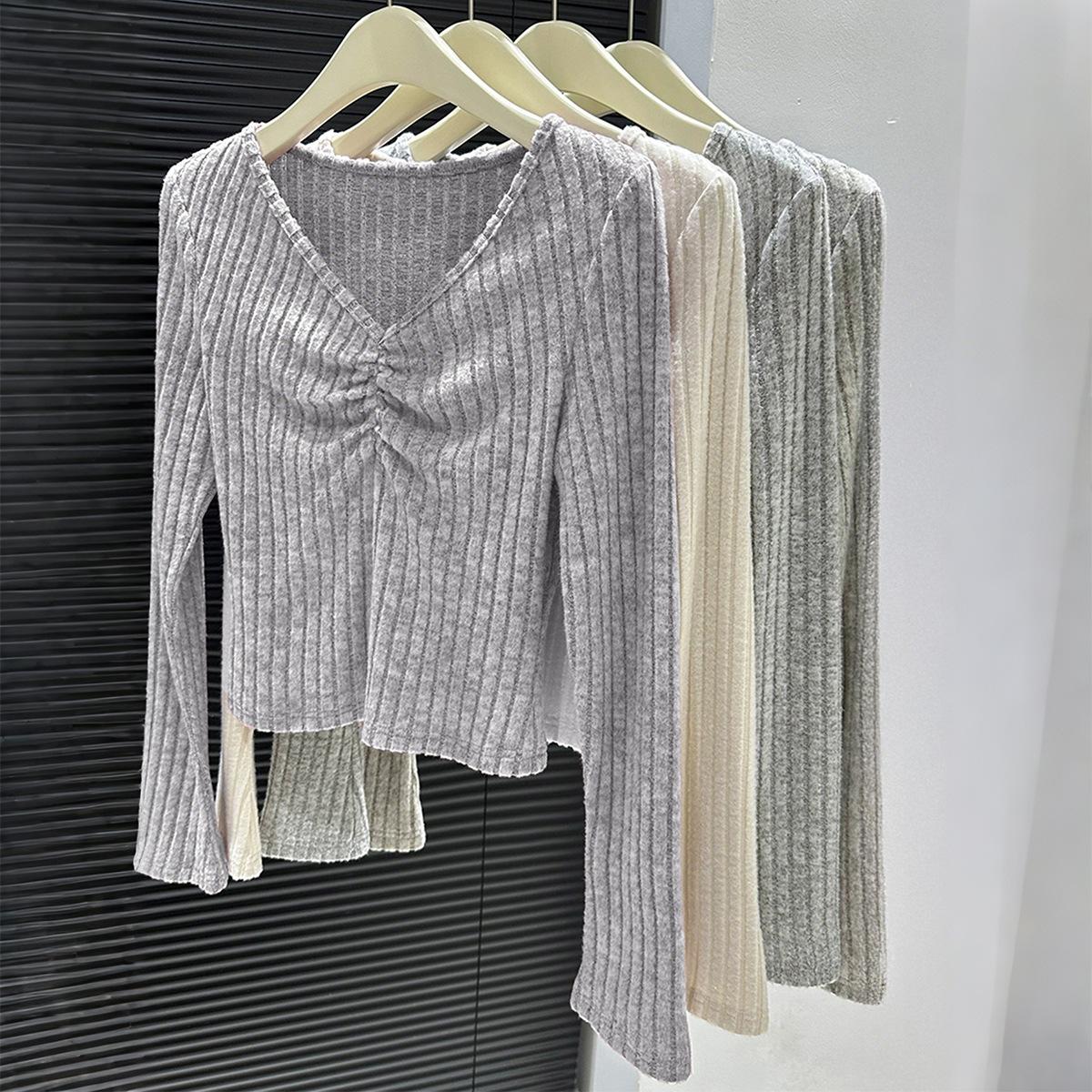 Модная простая базовая футболка с длинным рукавом Женская 2025 Осень-Зима V-образный вырез Универсальный однотонный пуловер S серый