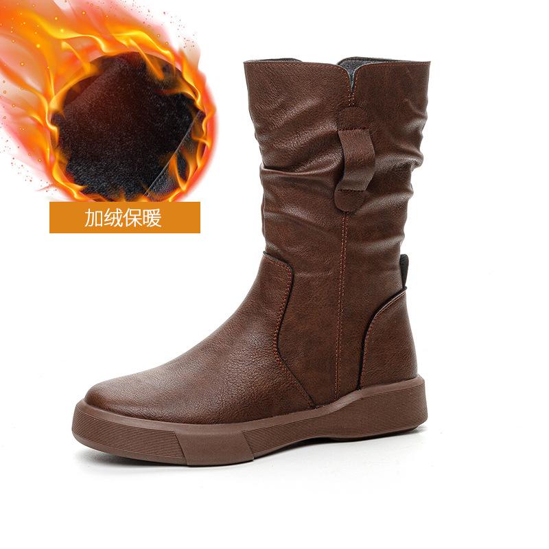 Модная ретро кожаная женская обувь зимние плюшевые теплые сапоги до середины икры круглый носок на молнии плиссированные 3,5 см толстая подошва рыцарские сапоги 42