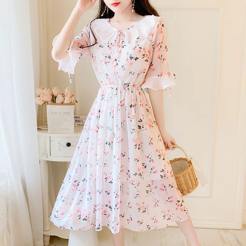 Модная свободная летняя темпераментная длинная Милая шифоновая юбка с кукольным воротником большого размера, элегантное сказочное Повседневное платье на шнуровке для женщин