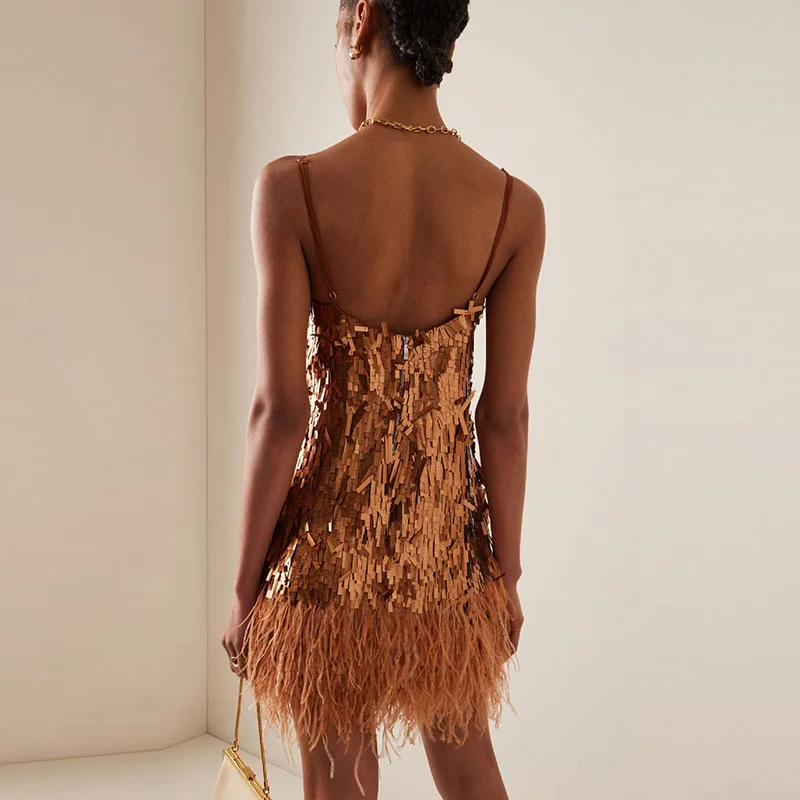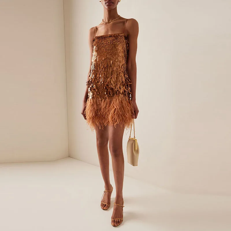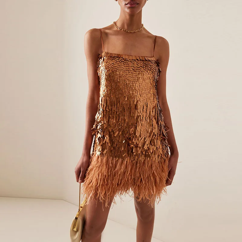 Модное Клубное платье в стиле пэчворк с блестками и перьями, летнее облегающее мини-платье с открытыми плечами, новинка 2024, женское платье на бретелях без рукавов