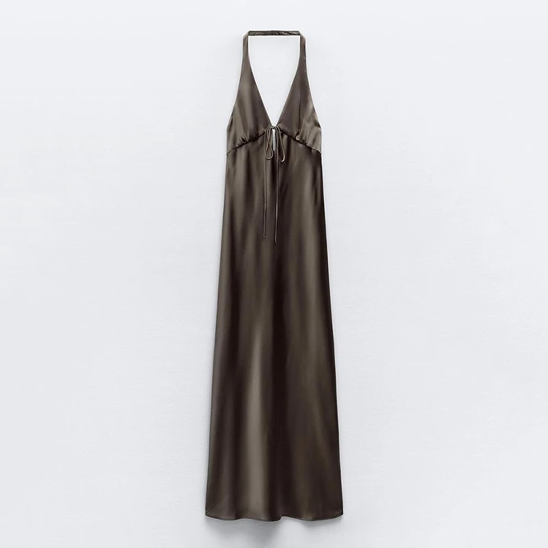 Модное атласное длинное платье с воротником, женские летние облегающие пляжные платья с открытой спиной 2024, осенняя женская уличная одежда, платья средней длины с лямкой на шее