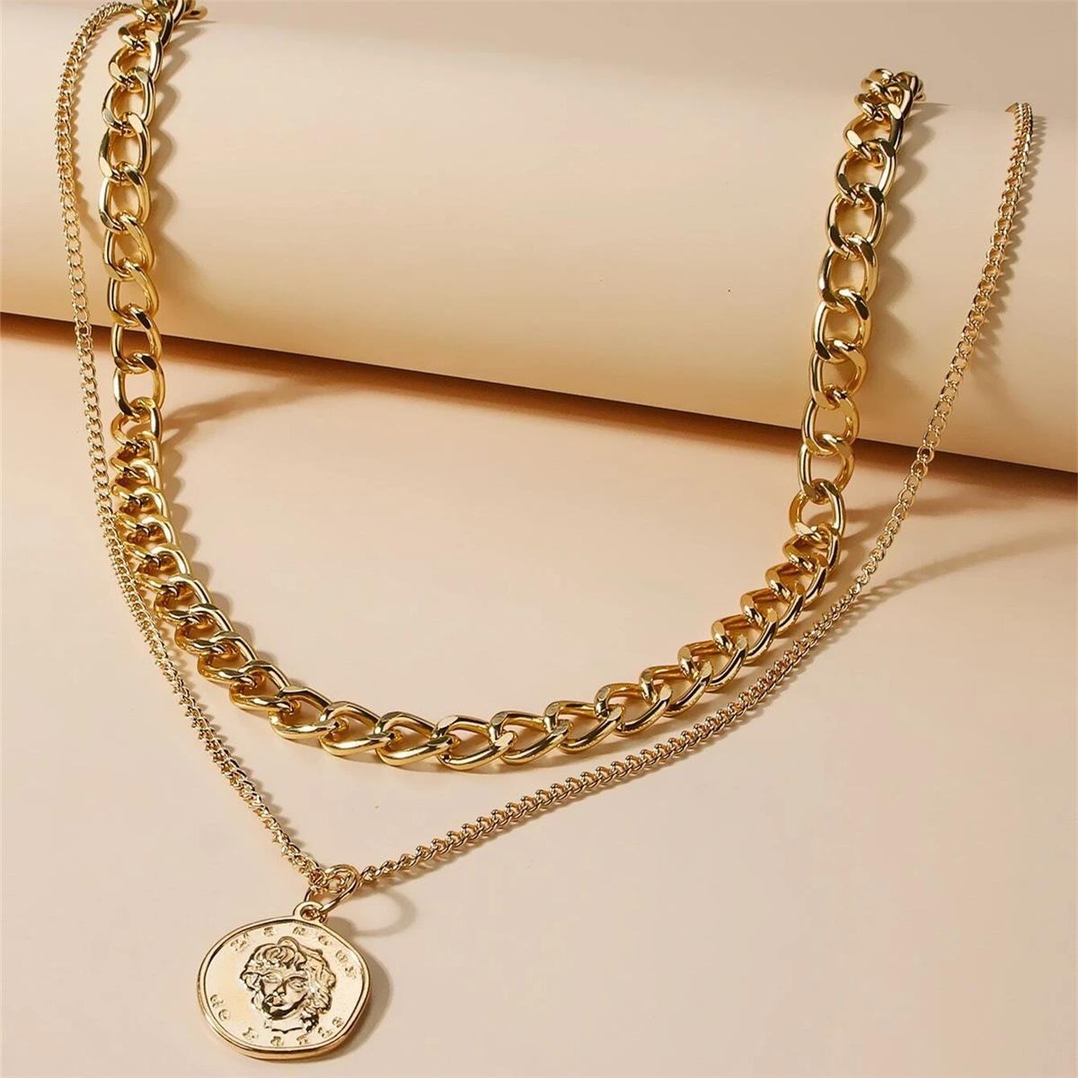 Модное двойное ожерелье из монет, круглая портретная толстая цепочка на ключицу золотой