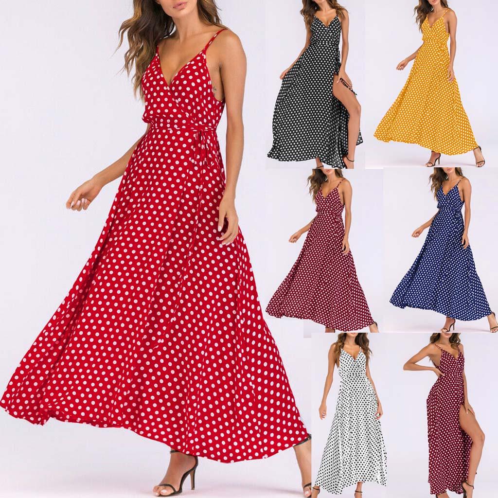 Модное женское длинное платье макси с v-образным вырезом без рукавов, пляжное длинное платье в горошек M красный