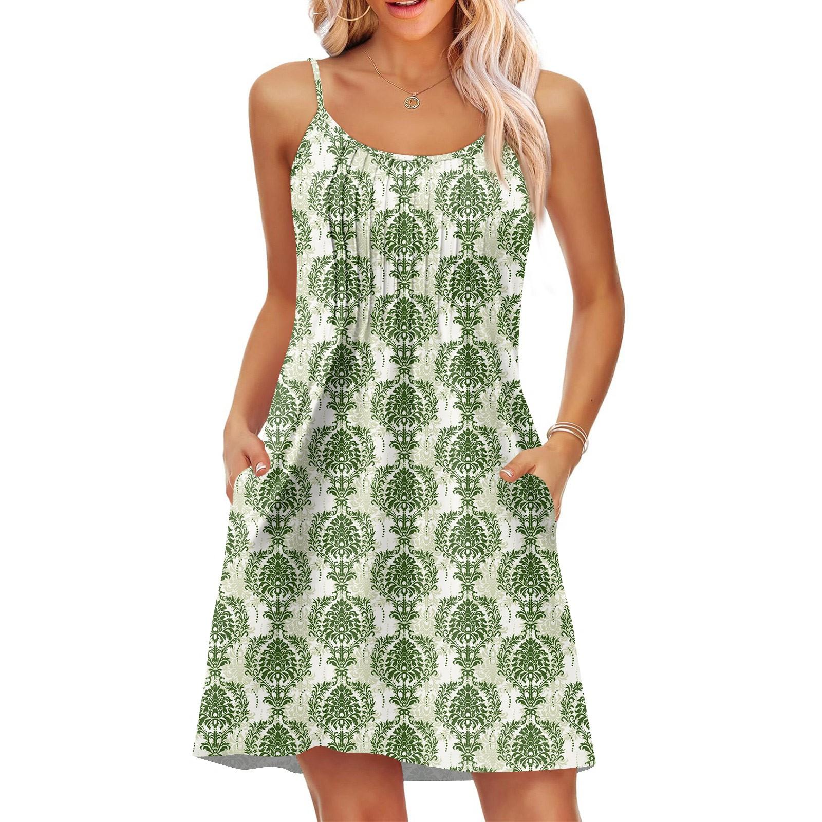 Модное женское летнее платье с винтажным цветочным принтом, регулируемые бретельки для пляжного отдыха, повседневное платье с карманами L зелёный