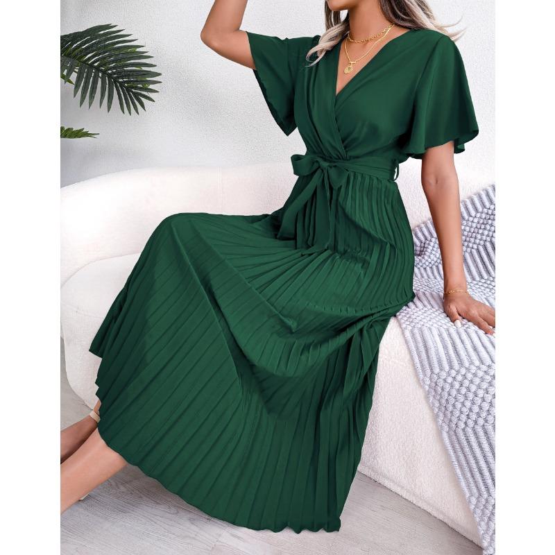Модное женское летнее платье с V-образным вырезом, коротким рукавом, повседневное, простое, однотонное, плиссированное, со шнуровкой, А-силуэта, для вечеринок, элегантная женская одежда S зелёный