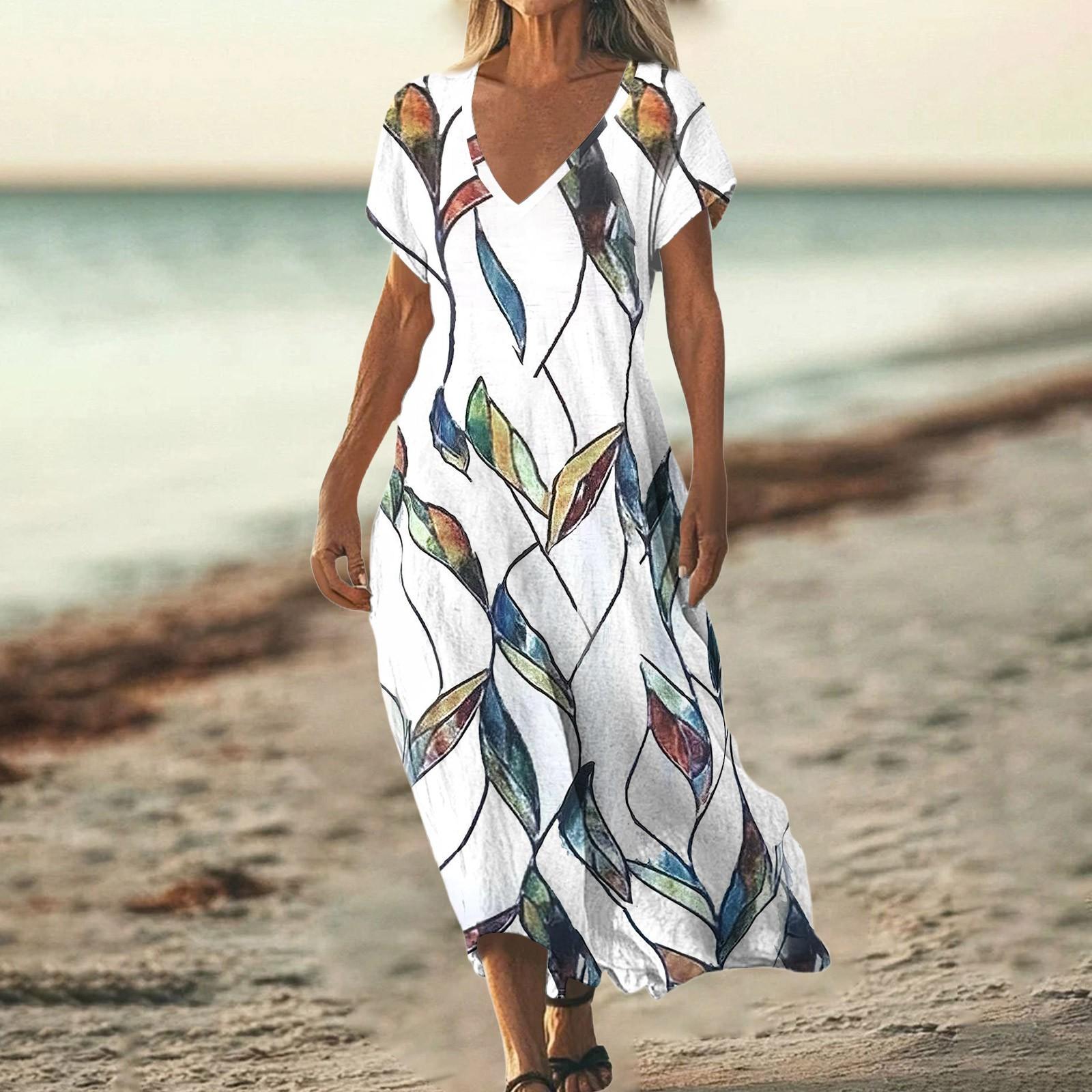 Модное женское летнее пляжное платье с V-образным вырезом и коротким рукавом с цветочным принтом M белый