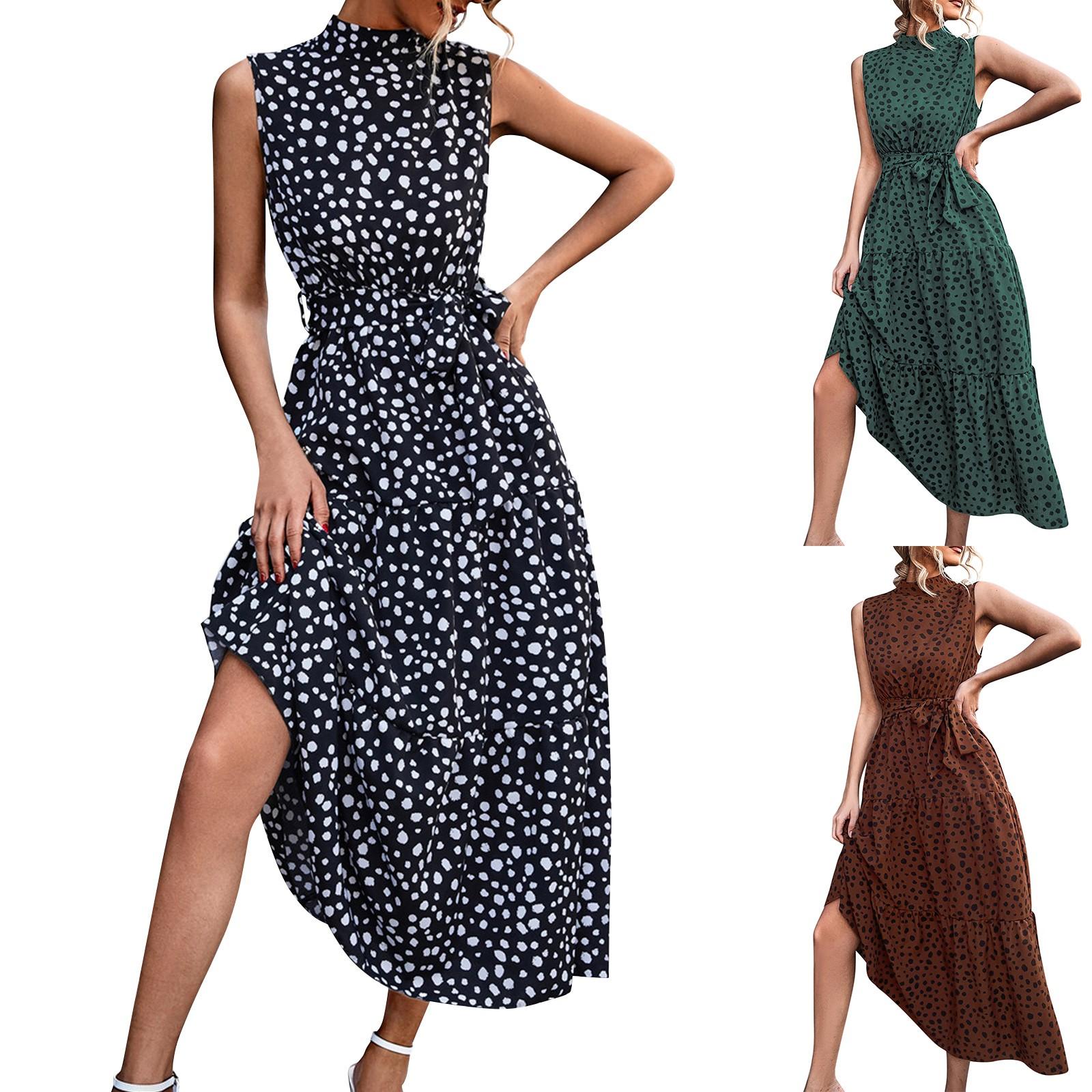 Модное женское летнее свободное платье с высоким воротником и поясом без рукавов в горошек миди-платье