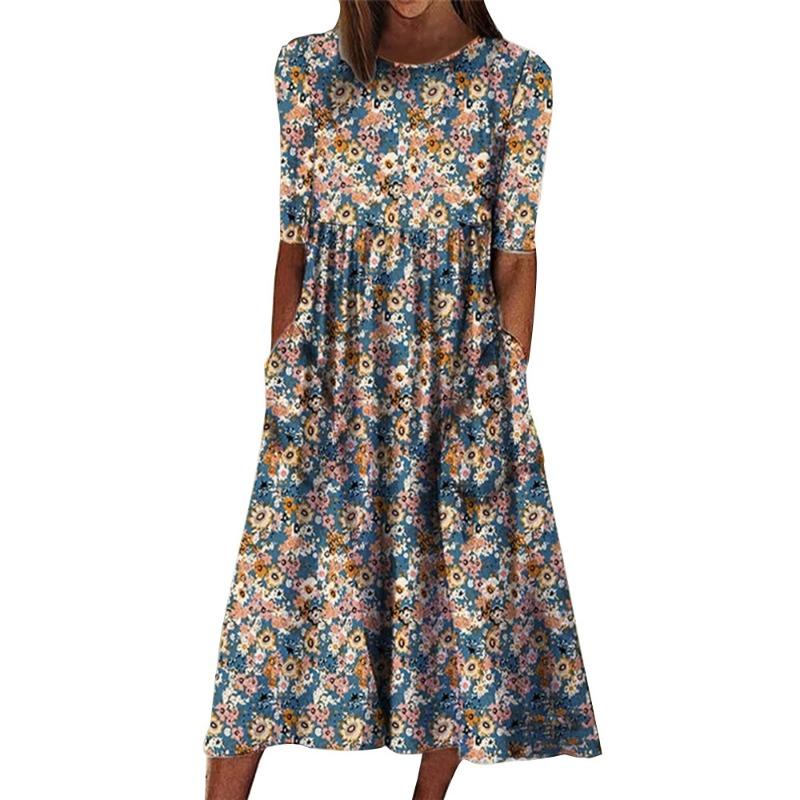 Модное женское платье с цветочным принтом больших размеров, летние карманные винтажные свободные повседневные платья, женские элегантные простые офисные женские платья с круглым вырезом 24258 S синий