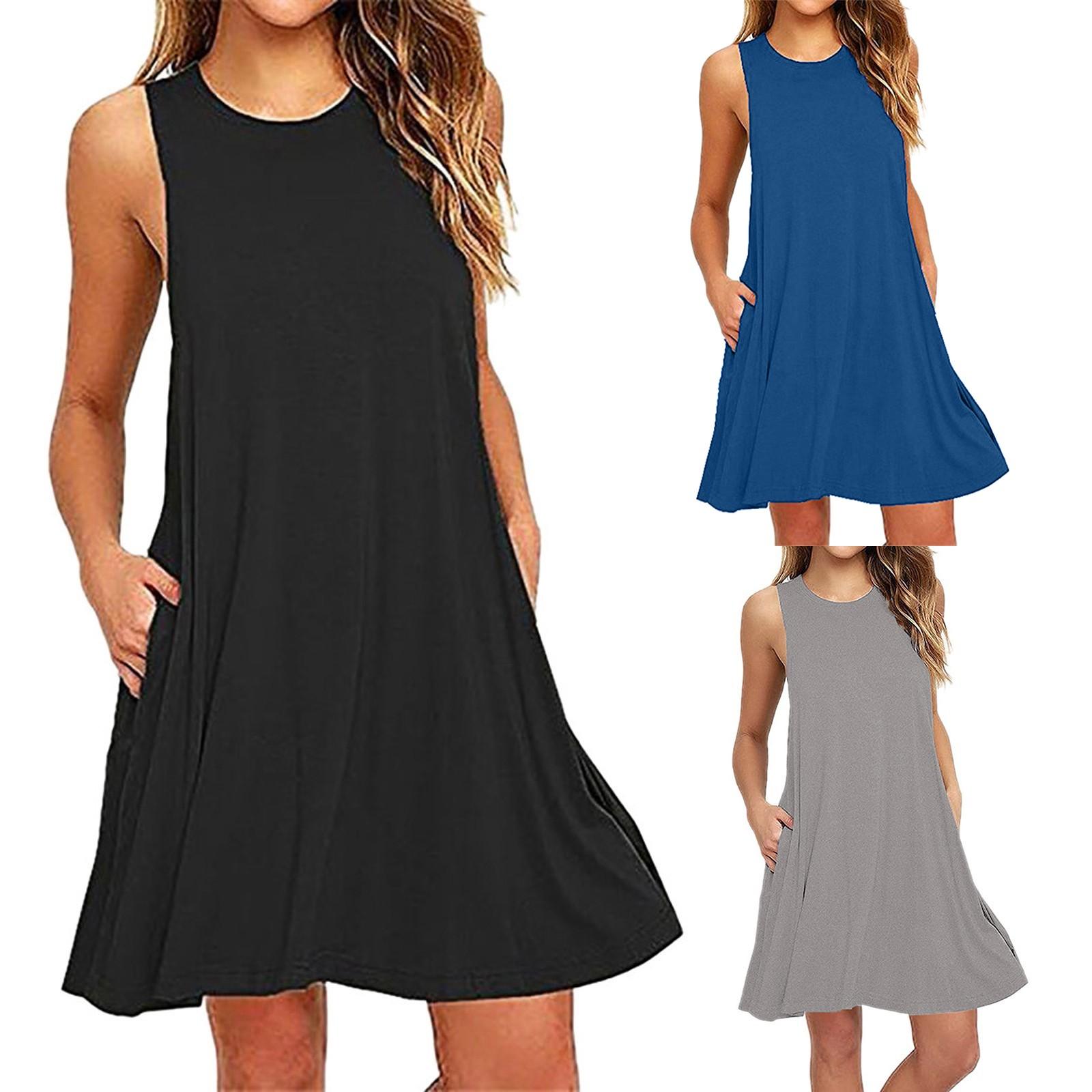 Модное женское повседневное однотонное платье без рукавов выше колена с карманами L чёрный