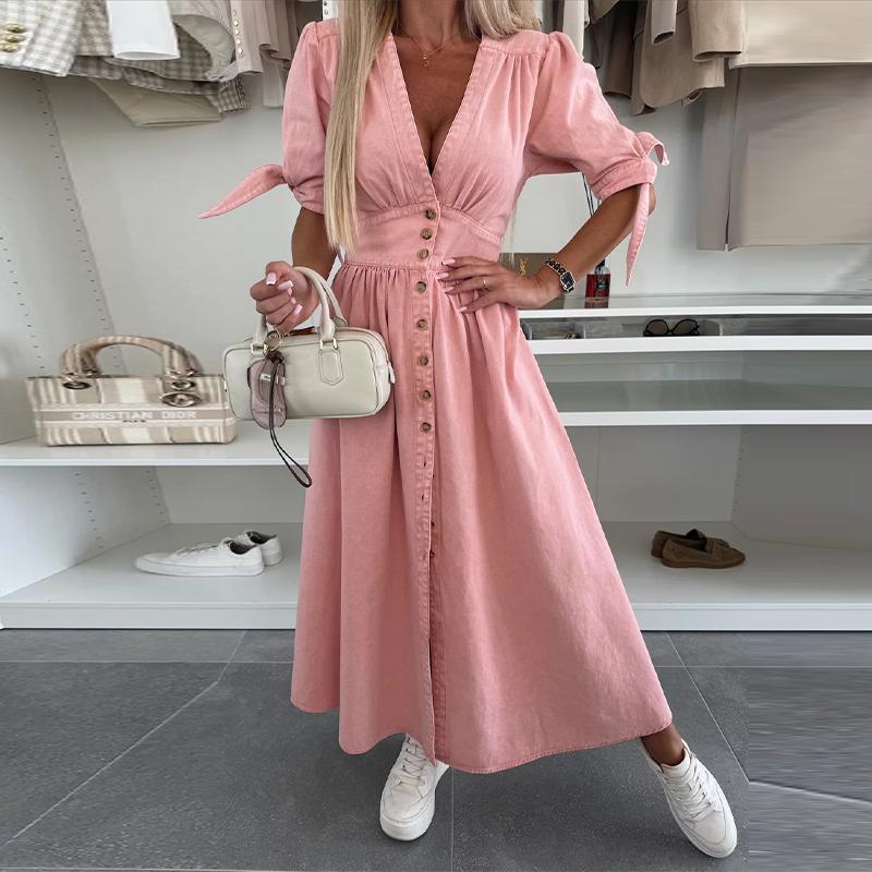 Модное сексуальное джинсовое платье с V-образным вырезом, женское однобортное платье А-силуэта с короткими рукавами, однотонные минималистичные платья для поездок на работу, весна и лето, новинка XL розовый