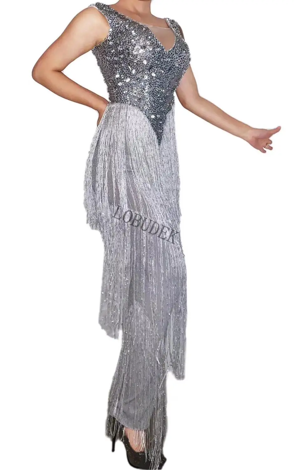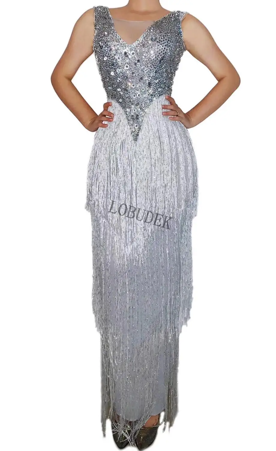 Модное серебряное Стразы Белое длинное платье с кисточками женский наряд для празднования дня рождения вечернее платье