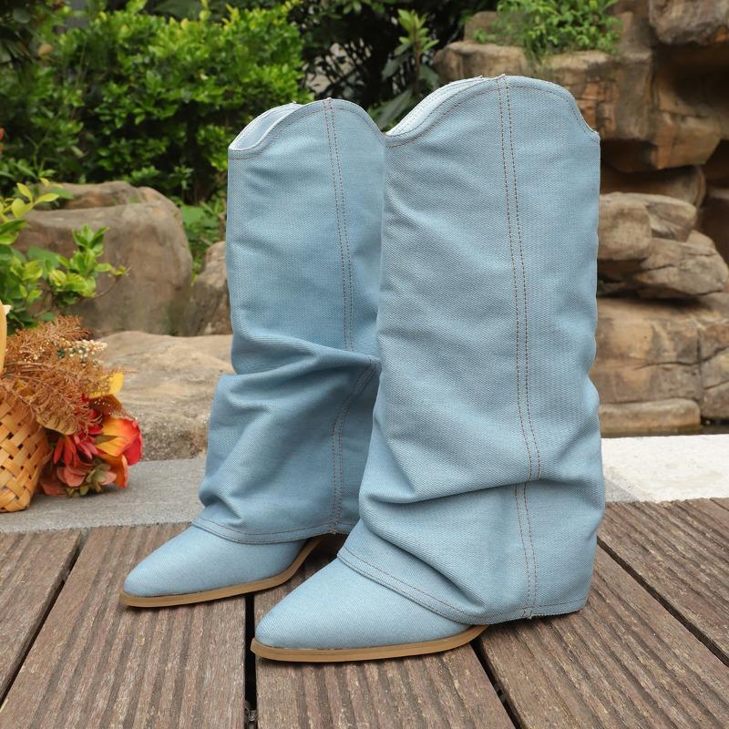 Модные Новые Ботильоны на Каблуке Женские Остроносые на Блочном Каблуке Винтажные Универсальные Без Колена Западные Джинсовые Высокие Сапоги Рыцаря 42 светло-синий